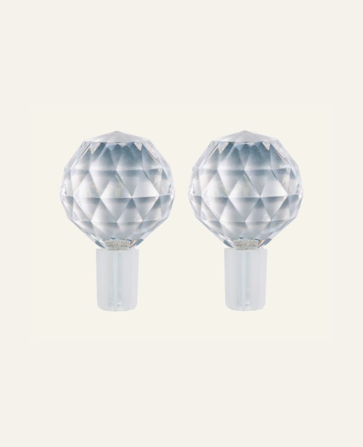Krystallformet endestykke som skrus inn i gardinstangen. Passer til tykk gardinstang. Alle våre endestykker selges i 2pk.