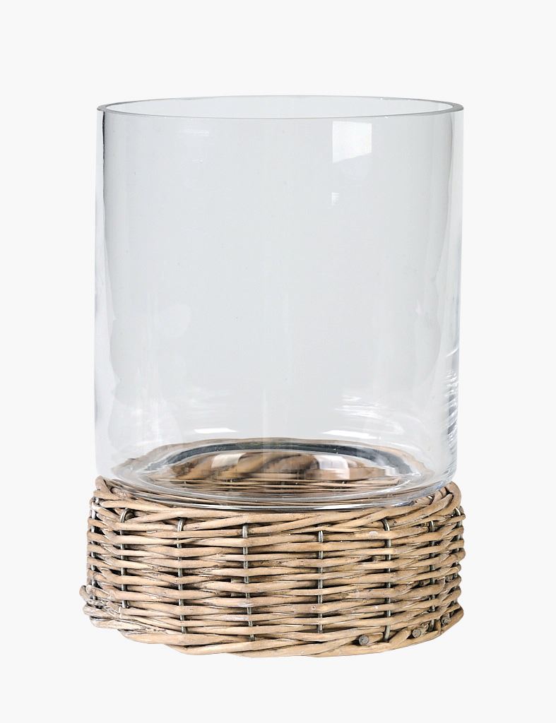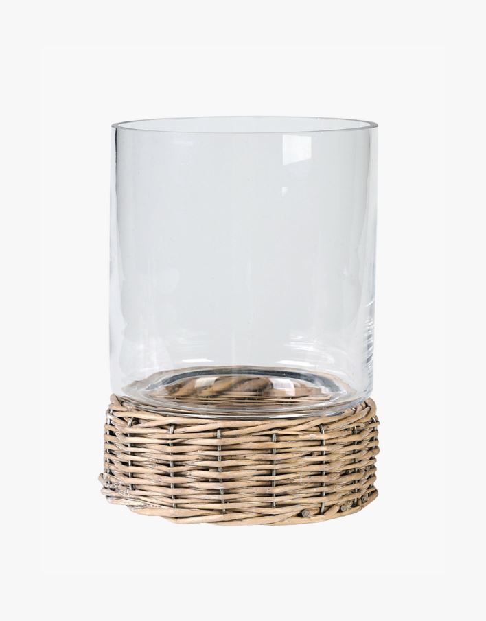 Telysholder med bunn i flettet rotting og glassinnsats som gir et varmt og behagelig lys.