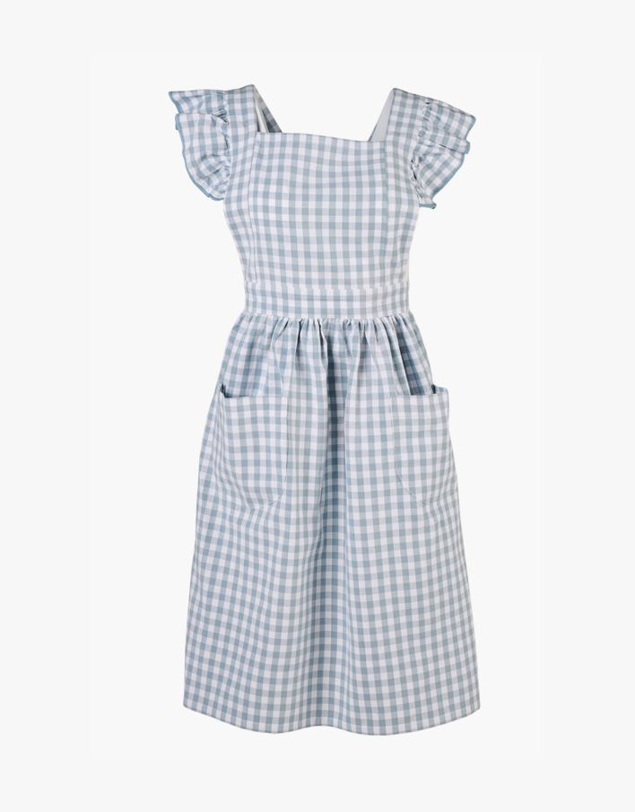 Koselig rutet forkle med volanger og lommer på siden.