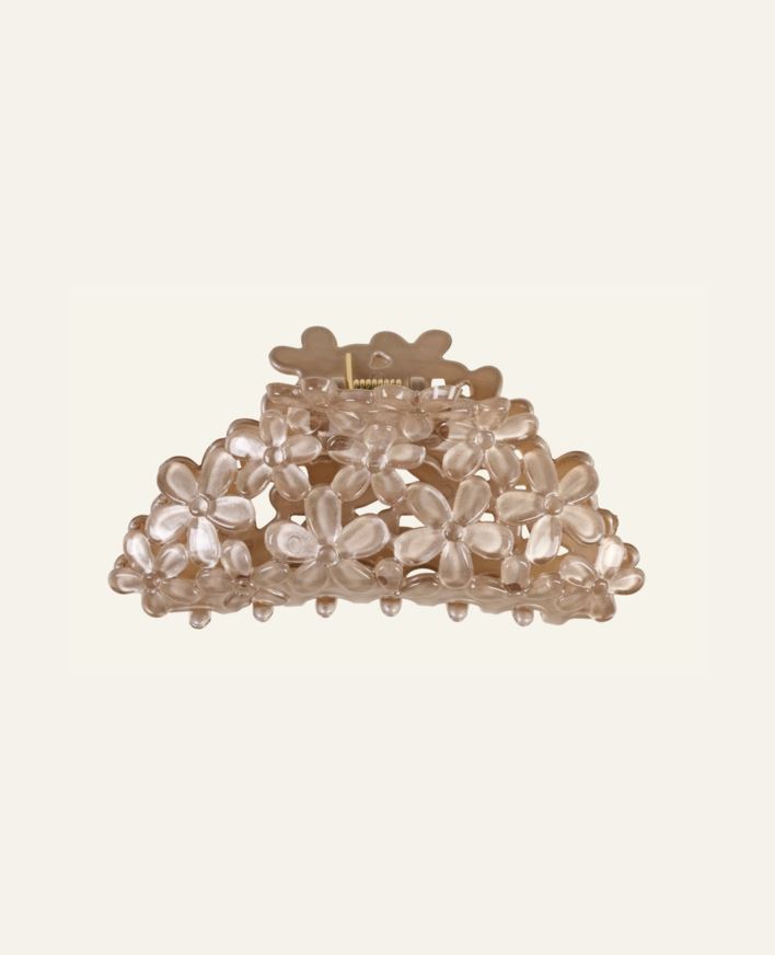Nydelig beige hårklype med blomstemønster. Et dekorativ hårtilbehør som holder håret skånsomt på plass.