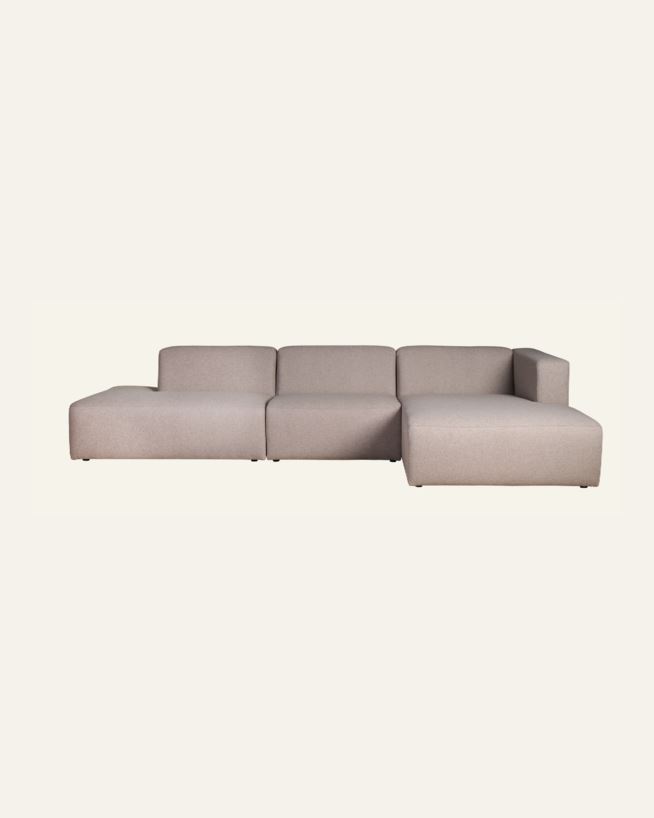 Trendy og svært komfortabel modulsofa i et slitesterkt tekstil. Plasseringen av ende og sjeselong på sofaen beskrives ut ifra hvordan du ser sofaen forfra. Venstre ende eller sjeselong er på venstre side når du står foran sofaen, og tilsvarende for h...